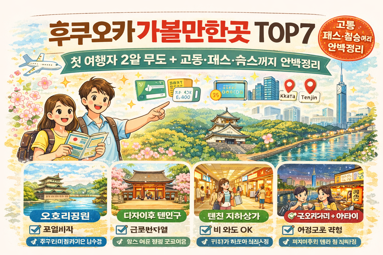 후쿠오카 가볼만한곳 TOP7|첫 여행자 2일 루트 + 교통·패스·숙소까지 완벽정리처음 가는 후쿠오카 여행은 “명소 선택”보다 동선·교통·숙소 위치에서 성패가 갈립니다. 이 글은 초보자가 가장 만족하는 TOP7만 골라, 그대로 따라하면 되는 2일 루트로 정리했습니다. 비 오는 날 대체 코스, 공항→도심 이동, 패스/교통카드, 숙소 지역까지 한 번에 끝내세요.바쁜 사람용 60초 요약도심 핵심: 하카타(이동·식사) + 텐진(쇼핑)만 잡아도 반은 성공근교 1곳: 다자이후 텐만구 반나절(텐진에서 니시테츠 이용이 대표적)야경: 후쿠오카타워는 보통 9:30~22:00(최종입장 21:30) 안내비 오는 날: 텐진 지하상가(590m 규모) + 캐널시티로 실내 전환 후쿠오카 TOP7 한눈 표순위장소초보자 포인트추천 시간1..
