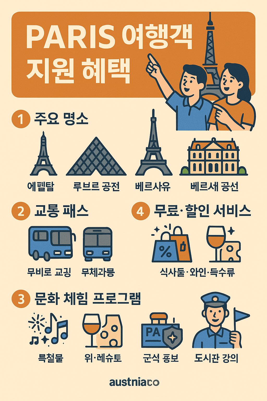 파리는 매년 수천만 명이 방문하는 세계적인 관광도시입니다. 에펠탑, 루브르 박물관, 베르사유 궁전 같은 대표 명소와 더불어 관광객을 위한 다양한 지원 혜택이 준비되어 있죠. 이번 글에서는 파리에서 받을 수 있는 교통, 무료·할인, 안전, 문화 체험 지원까지 알차게 정리했습니다.