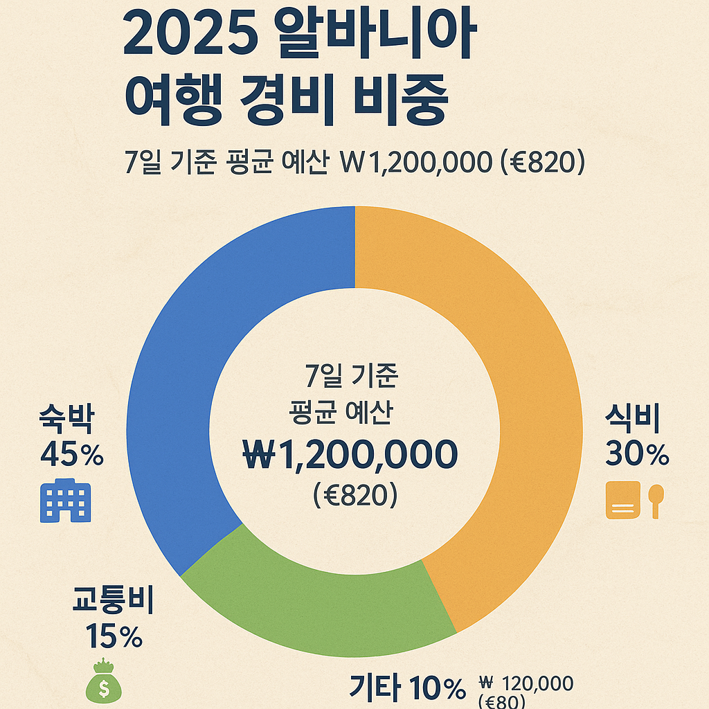 아래 예산표는 보통(중간) 여행자 기준의 알바니아 여행 비용 2025 예시입니다. 여행 스타일·시즌·환율에 따라 달라질 수 있으므로 참고 기준으로 활용하세요.