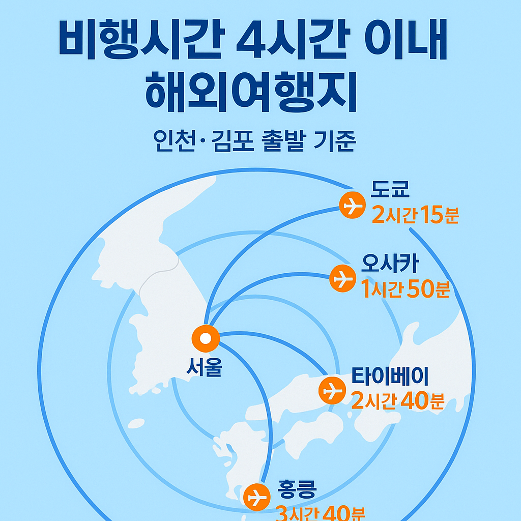 핵심 요약: 2025년 현재, 대한민국에서 비행시간 4시간 이내 해외여행지는 일본(도쿄·오사카·후쿠오카), 타이완(타이베이), 홍콩이 대표적입니다. 평균 비행시간은 1시간 20분에서 3시간 55분 수준이며, 엔저 효과와 항공권 경쟁으로 비용 부담이 줄었습니다. 주말 2박 3일 또는 연차 3박 4일 일정에 최적화되어 있으며, 각 도시별 물가·추천 일정·예약 팁까지 정리했습니다.