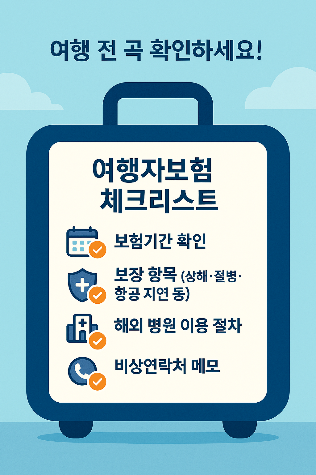 ✔ 국내 건강보험이 해외에서 적용되지 않는 경우가 많으므로 해외 의료비 보장을 반드시 확인하세요.