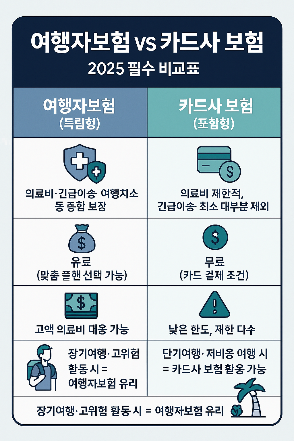 ✅ 단기·저예산 여행이나 이미 좋은 신용카드 혜택이 있는 경우 → 카드사 보험을 기본으로 활용할 수 있습니다.