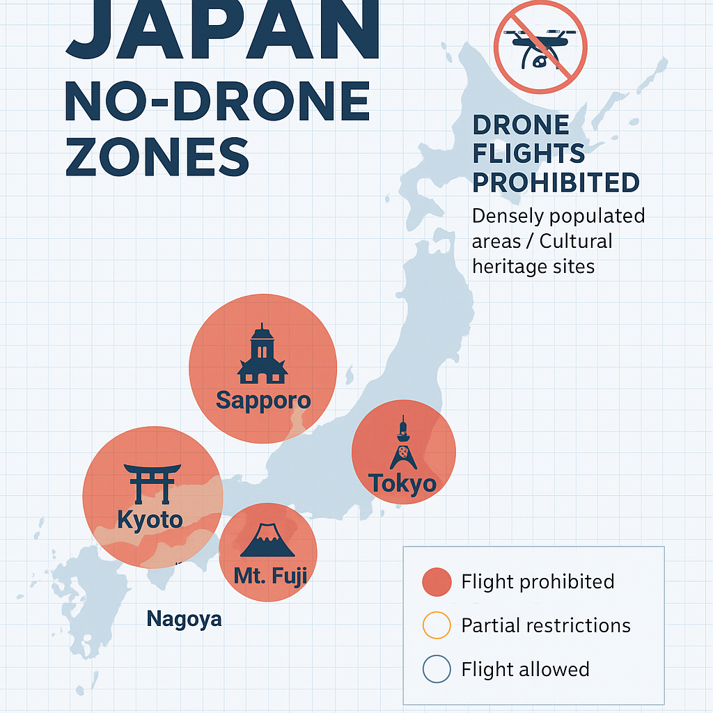 - 비행 금지 지역: 공항 주변, 도심 밀집지역, 황궁·관저 주변, 국립공원 등.