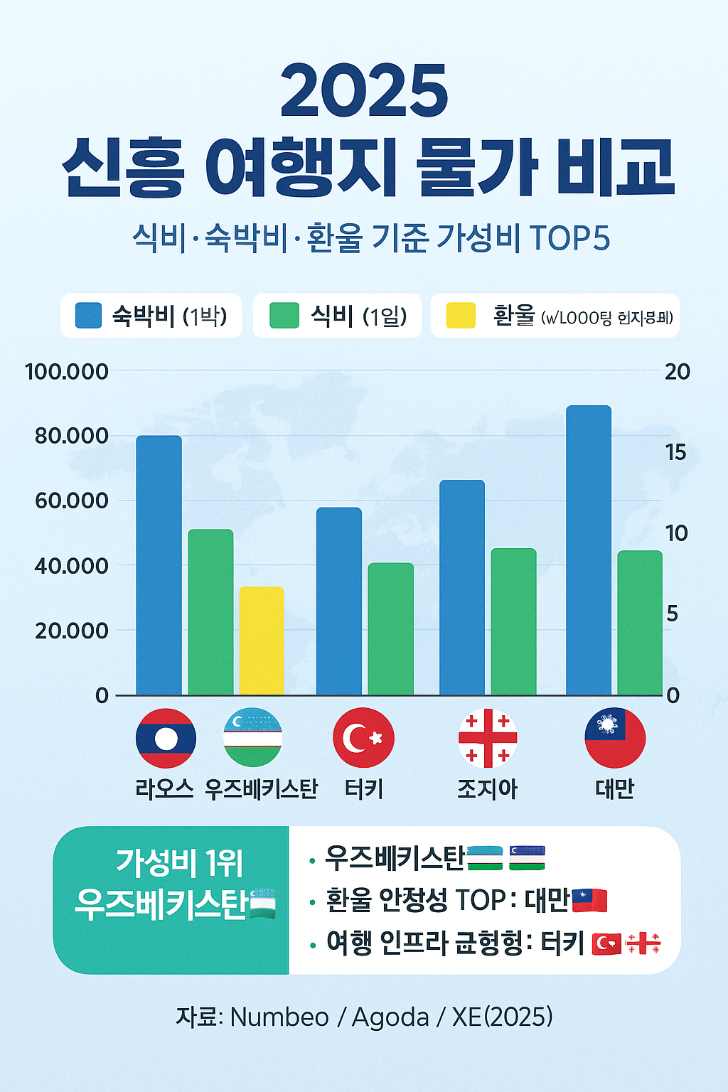 둘째, 환전은 현지 화폐와 국제카드를 병행하는 것이 좋다. 라오스(낍), 우즈베키스탄(숨), 조지아(라리)는 현지 환전소를 이용하고, 터키·대만은 카드 결제 비중을 높이면 편리하다.