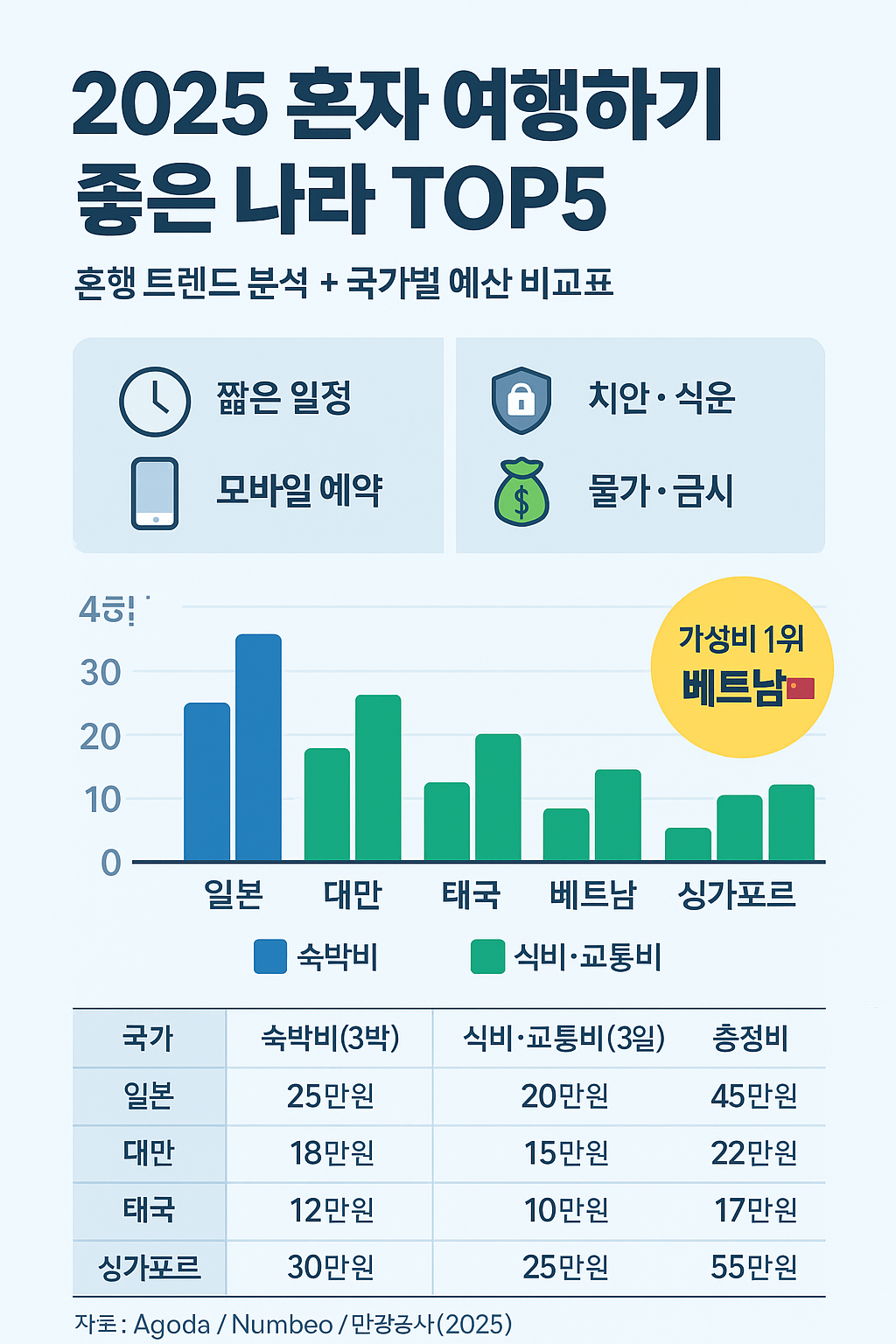 TOP5 혼행 추천국: 일본 / 대만 / 태국 / 베트남 / 싱가포르