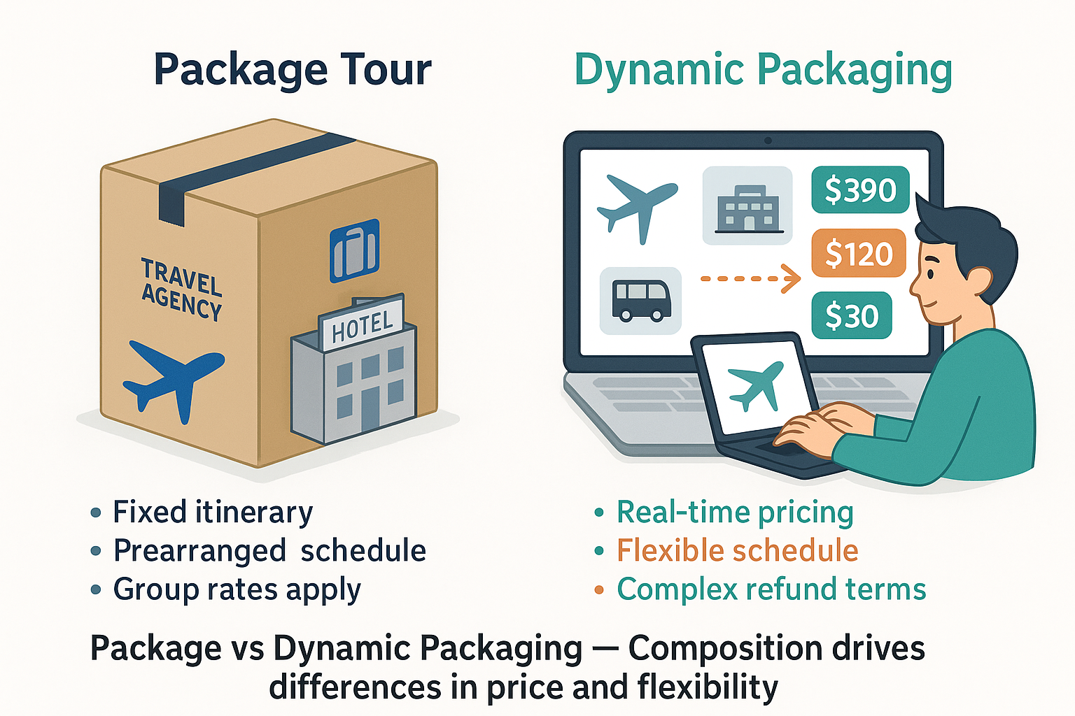 일본과 한국에서도 OTA(온라인 여행사)의 실시간 조합형 상품(Dynamic Packaging)이 확대되며, 일부는 ‘패키지 여행법’의 보호를 받습니다.